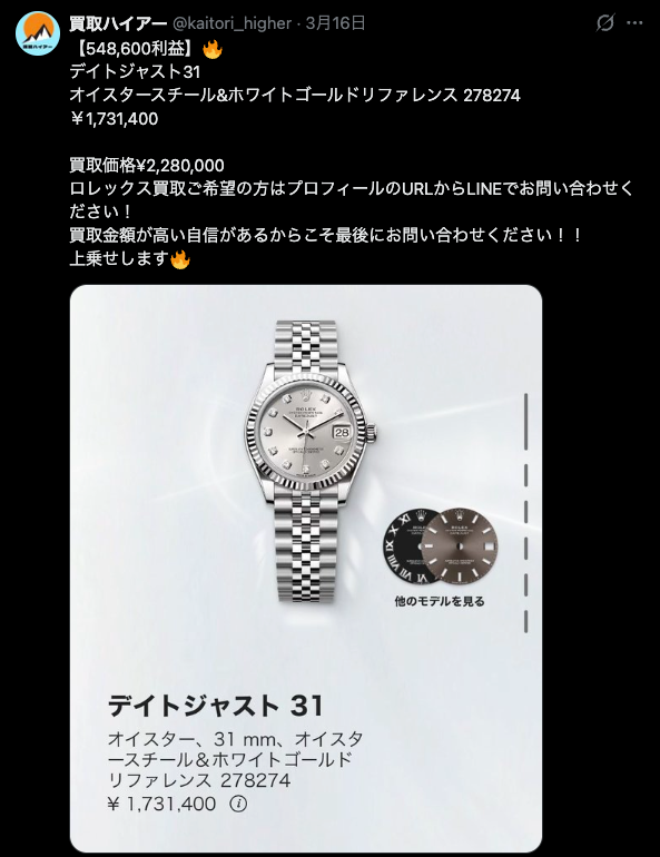 ロレックスを購入して買取屋に出すだけで即現金化できるので、資金ロックされずにすみますし、なんなら資金なくてもクレカ枠さえあれば「一撃635,000円」稼げてしまうわけです。